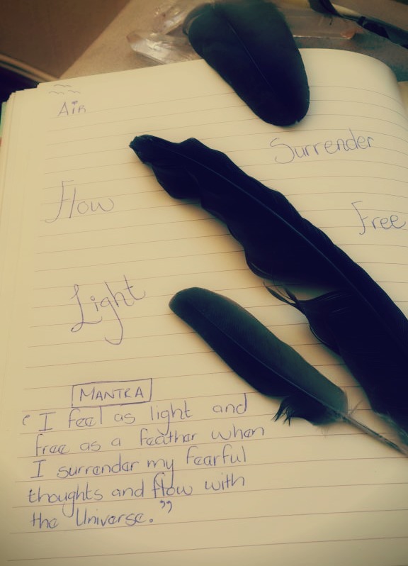 As per the image above, a while ago I used feathers for my Air/Mental mantra. The words tied to the qualities of the feather that stood out to me were: Light, Free, Surrender and Flow. At the time I was resisting flow a lot and struggling to surrender to what was. The mantra that I came up with was thus: “I feel as light and free as a feather when I surrender and flow with the Universe.” The more I used this affirmation, the easier it became to surrender and flow.